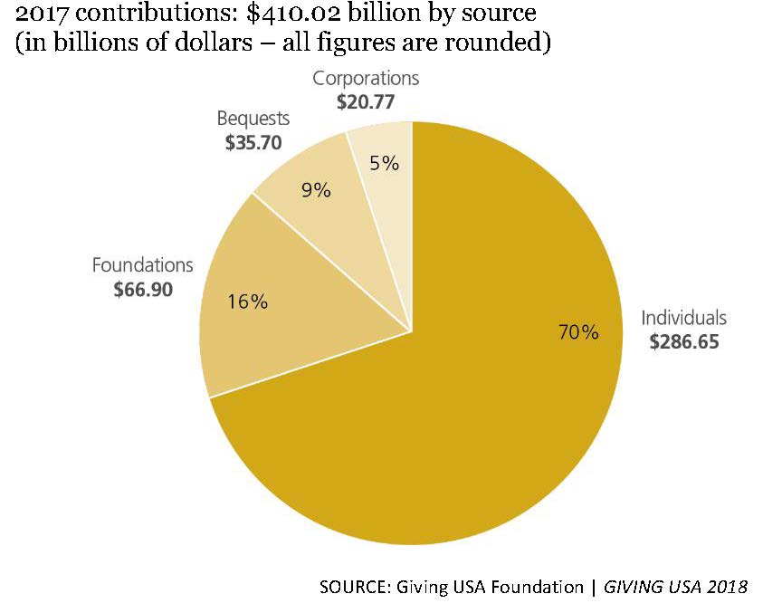 All four sources of giving – individuals (70 percent of the total), foundations (16 percent), bequests (9 percent) and corporations (5 percent) increased their 2017 donations over 2016, according to the report.