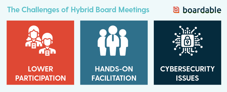 While hybrid meetings are an increasingly popular approach for boards, there are some obstacles. However, with an understanding of what you’re up against, you can proactively prepare for any challenges and learning curves. Just like with the advantages we laid out, we can break down potential obstacles into three categories: